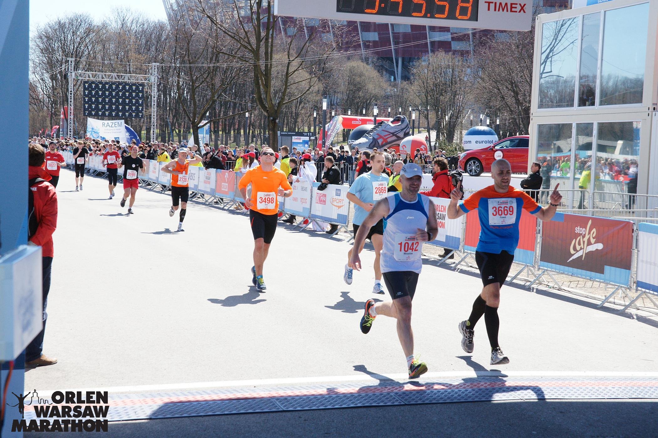 Do 30 kilometra wszystko przebiegało w jak najlepszym porządku, a potem zaczęły się schody. Ciężko mi było utrzymać wcześniejsze tempo, psycha zaczęła mi siadać. Myślę sobie: po co ja tyle biegnę? może się kawałek przejdę? męczy mnie to tempo… (a to raptem 5.10…) byle do 37km… teraz nawet jak będę biegł po 6.00 to i tak zrobię życiówkę… Udało mi się przezwyciężyć te wszystkie myśli, i biegłem, biegłem, a raczej truchtałem do samego końca. Na Alejach Ujazdowskich, kiedy widać już było Rondo De Gaulla i palmę poczułem, że to już końcówka. Na rondzie jednak musiałem się na chwilę zatrzymać. Czułem, że jeśli pobiegnę jeszcze kawałek, to złapie mnie skurcz w dwugłowy uda. Stanąłem, rozciągnąłem mięsień, rozmasowałem chwilę i pobiegłem dalej. To, co działo się ze mną tutaj, na Moście Poniatowskiego we wrześniu, teraz było zupełnie odwrotne. To ja wyprzedzałem wszystkich tych, którzy nie mogli biec i szli. W oddali majestatycznie wznosił się Stadion Narodowy, a to oznaczało tylko jedno – meta jest tuż tuż. Gdy wbiegłem na ostatnią 500-metrową prostą zacząłem biec szybciej. Co chwila spoglądałem na zegarek i liczyłem w głowie czy złamię 3.45. Widziałem już metę, zegar i upływające szybko sekundy. Wiedziałem że złamać się nie uda ale ostatecznie wbiegłem na metę w 3 godzinie 45 minucie i 12 sekundzie. orlenmeta2