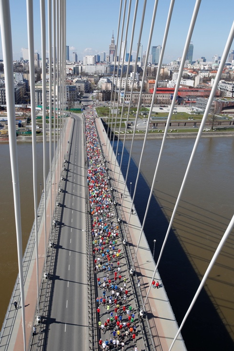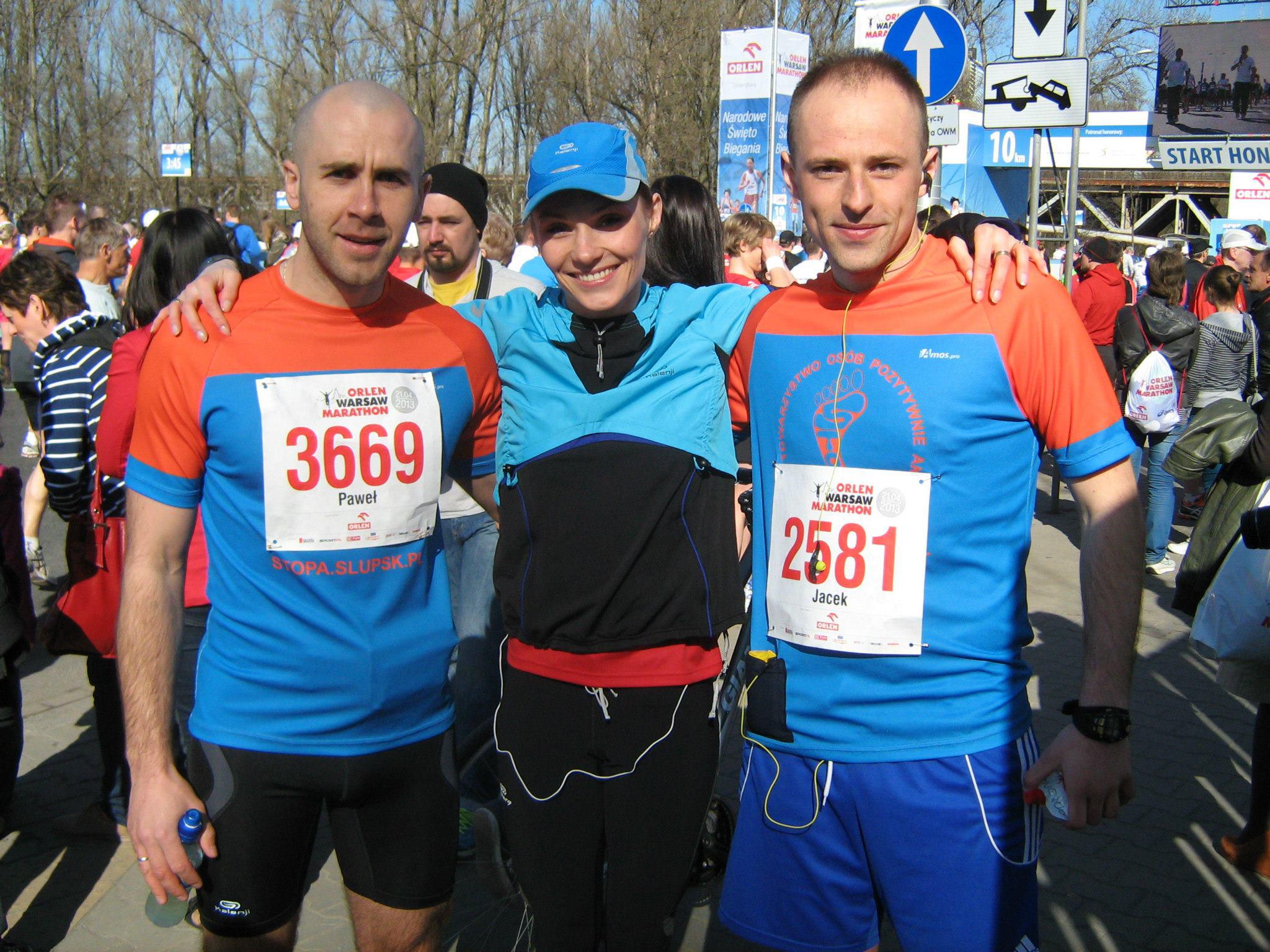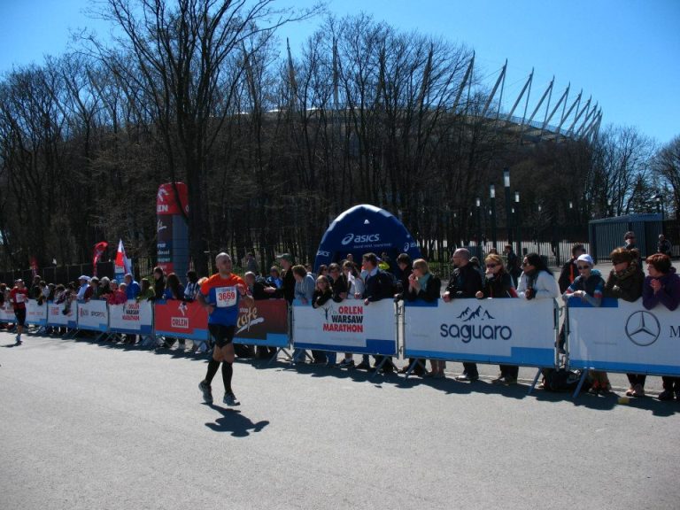 W sobotę o godzinie 8 rano wyruszyłem ze Słupska z kolegami z Team Spirit i z wielką nadzieją do Warszawy. Podróż upłynęła nam w wesołej atmosferze na rozmowach o dupie Maryni:) Tematem wiodącym było oczywiście bieganie. O godzinie 15 dojechaliśmy na miejsce czyli pod Stadion Narodowy, gdzie znajdowały się biura zawodów, targi Expo oraz miasteczko biegaczy. Po odbiorze pakietów startowych rozdzieliliśmy się, ja poszedłem obejrzeć targi i odebrać pakiet na bieg charytatywny. W biurze zawodów spotkałem naszą koleżankę Martę, która z Domtelem siedziała w Warszawie już od środy. Po krótkiej pogawędce udałem się zakupić żele węglowodanowe i tabletki potasu z magnezem. Zacząłem sobie w głowie układać plan odżywiania na trasie. O 17 pojechałem na zasłużony odpoczynek do znajomych na Żoliborz. Miałem jeszcze zamiar wrócić na stadion na Pasta Party, gdzie byli Ania z Jackiem ale po wyjściu z domu bez kuponu odechciało mi się wracać po niego i wychodzić ponownie. W zamian za to otrzymałem na miejscu olbrzymią porcję spaghetti z pysznym sosem. Moja porcja była mega wielka i chyba dobrze się stało, że zjadłem ją w domu, bo potem słyszałem głosy, że na pasta party jedzenia było mało i nie wystarczyło dla wszystkich. Wieczorem położyłem się do łóżka przed telewizorem z chęcią obejrzenia gali boksu, niestety pamiętam tylko 1 rundę pierwszej walki… Obudziłem się wypoczęty i gotowy do biegu. Spojrzałem na zegarek – 3 w nocy. Nie było to korzystne dla mnie ale nie chciało mi się już spać. Męczyłem się tak do godziny 6.30, w międzyczasie jednak chyba przysnąłem bo śniło mi się, że spadł śnieg i miałem kłopot, w czym pobiegnę. Na szczęście dotrwałem do rana, zjadłem porcję płatków owsianych, kanapeczkę z miodem i o 8 rano pojechałem na start. Pogoda była wspaniała. Na błękitnym niebie świeciło słońce, atmosfera przesiąknięta była podekscytowaniem tłumów biegaczy, którzy schodzili się ze wszystkich stron. W bardzo dobrze zorganizowanej strefie z depozytami zostawiłem swoje rzeczy i spokojnie skierowałem swoje kroki na Wybrzeże Szczecińskie, gdzie zlokalizowany był start. start