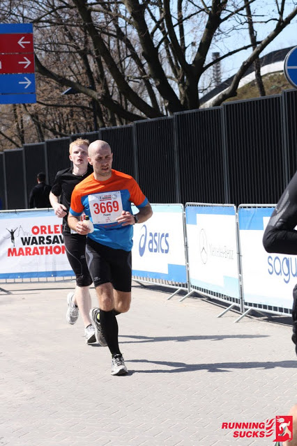 Przez pierwsze 5 kilometrów męczyłem się strasznie. Myślałem sobie, po co ja tu przyjechałem, w ogóle nie chce mi się dzisiaj biegać, czułem się słabo i bolały mnie nogi. Dopiero po 5 kilometrze nabrałem luzu i biegło mi się naprawdę dobrze. Na ulicy Konwiktorskiej mieliśmy mijankę z zawodnikami czołówki biegu na 10km. Chwilę później mignął mi Artur Pelo, którego głośno pozdrowiłem, a po chwili cała reszta biegaczy mijała nas po lewej stronie. W tłumie wypatrzyłem Justynę Kowalczyk, która ukończyła bieg w rewelacyjnym czasie 36 minut. Gdy minęliśmy Krakowskie Przedmieście skręciliśmy w lewo w Tamkę, na której był stromy zbieg. Postanowiłem puścić nogi luźno i prawą stroną ulicy szybko zbiegłem na dół notując na tym kilometrze czas 4.15. Potem tempo się już wyrównało i biegłem sobie spokojnie koncentrując się na odpowiednim nawadnianiu i przyjmowaniu żelów i tabletek magnezu z potasem. Niestety tabliczki z oznaczeniem kolejnych kilometrów od początku trasy były źle poustawiane więc polegać musiałem na moim telefonie i aplikacji endomondo. Jak zauważyłem już na wcześniejszych maratonach, do półmetka, 25 kilometra słychać rozmowy, żarty. Potem stopniowo się to wycisza i wreszcie milknie. Wszyscy biegną w milczeniu, każdy sam w ciszy przeżywa swój maraton. To niesamowite wrażenie.OrlenMaraton2013_2816