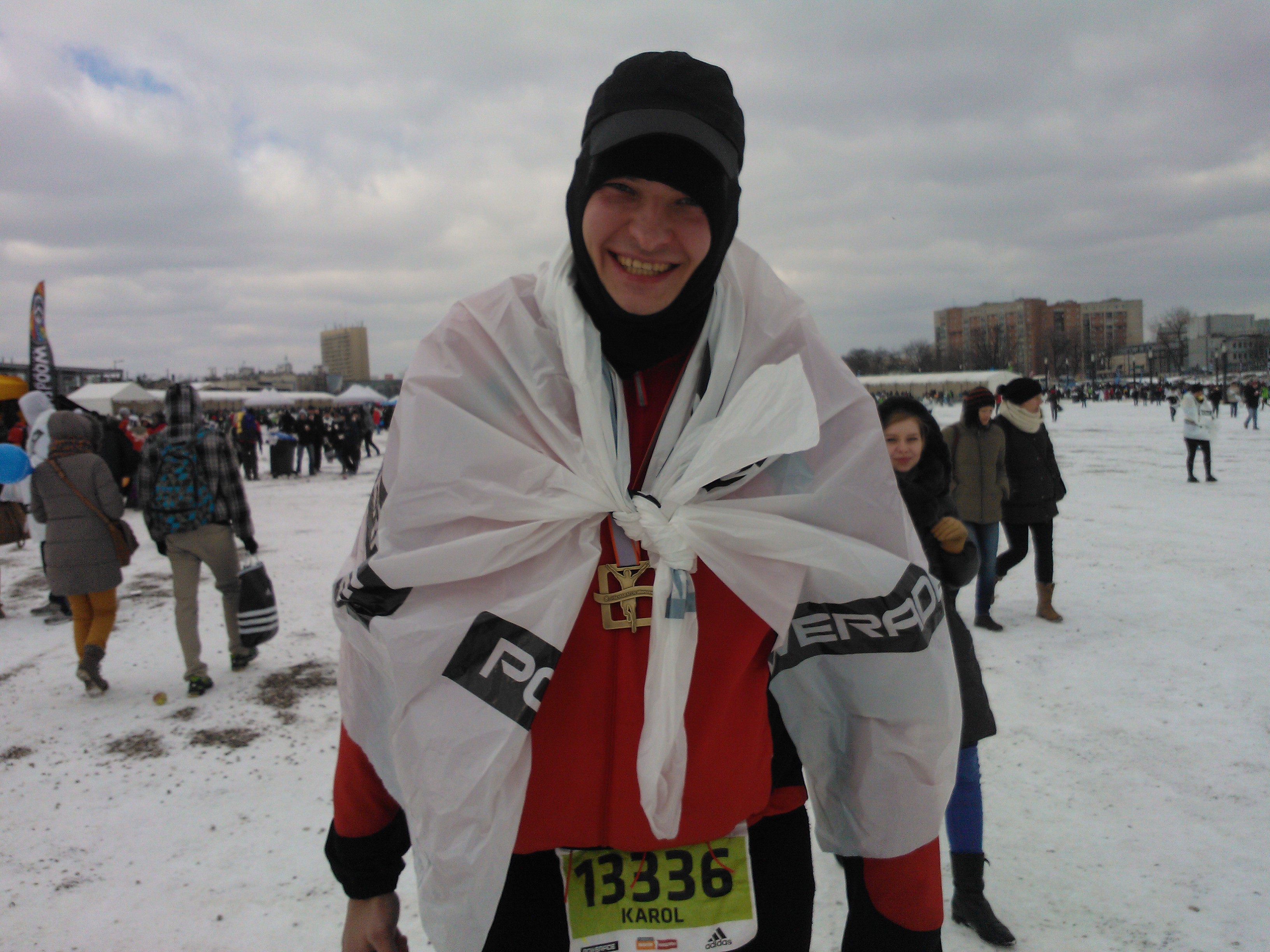 dobrze przygotowani do panujących wyjątkowo mroźnych warunków klimatycznych. Zabrakło koksowników, większej ilości punktów z ciepłymi napojami, napoje podawane w punktach na trasie były mega lodowate. Trasa przebiegała ulicami Starego Miasta w Warszawie, Wisłostradą, Mostem Poniatowskiego i meta na placu przy Stadionie Narodowym. Podobno byli jacyś celebryci lecz żadnego nie spotkałem na trasie. Ponoć biegła jakaś dziennikarka z TVN-u i Maciej Dowbor.
